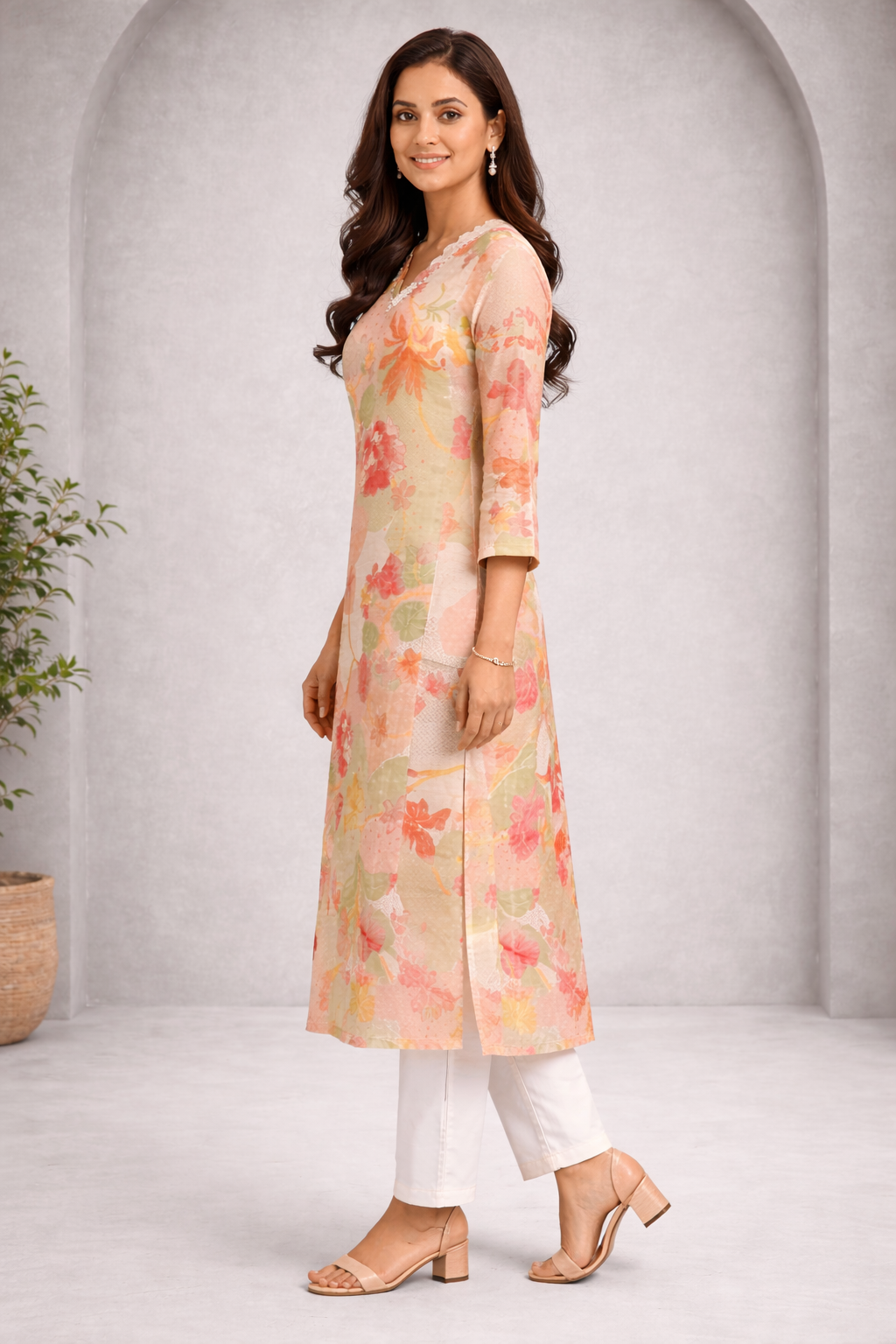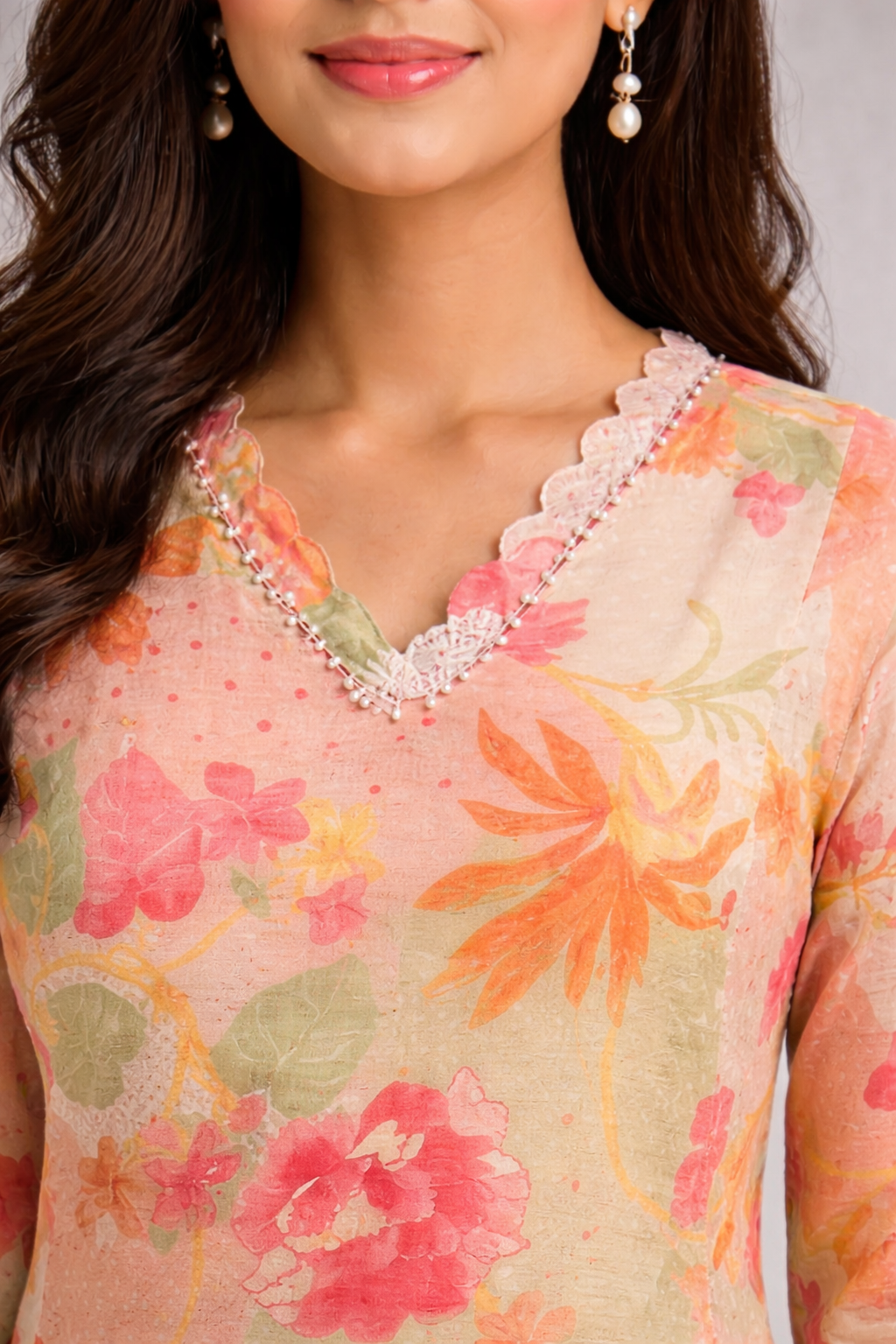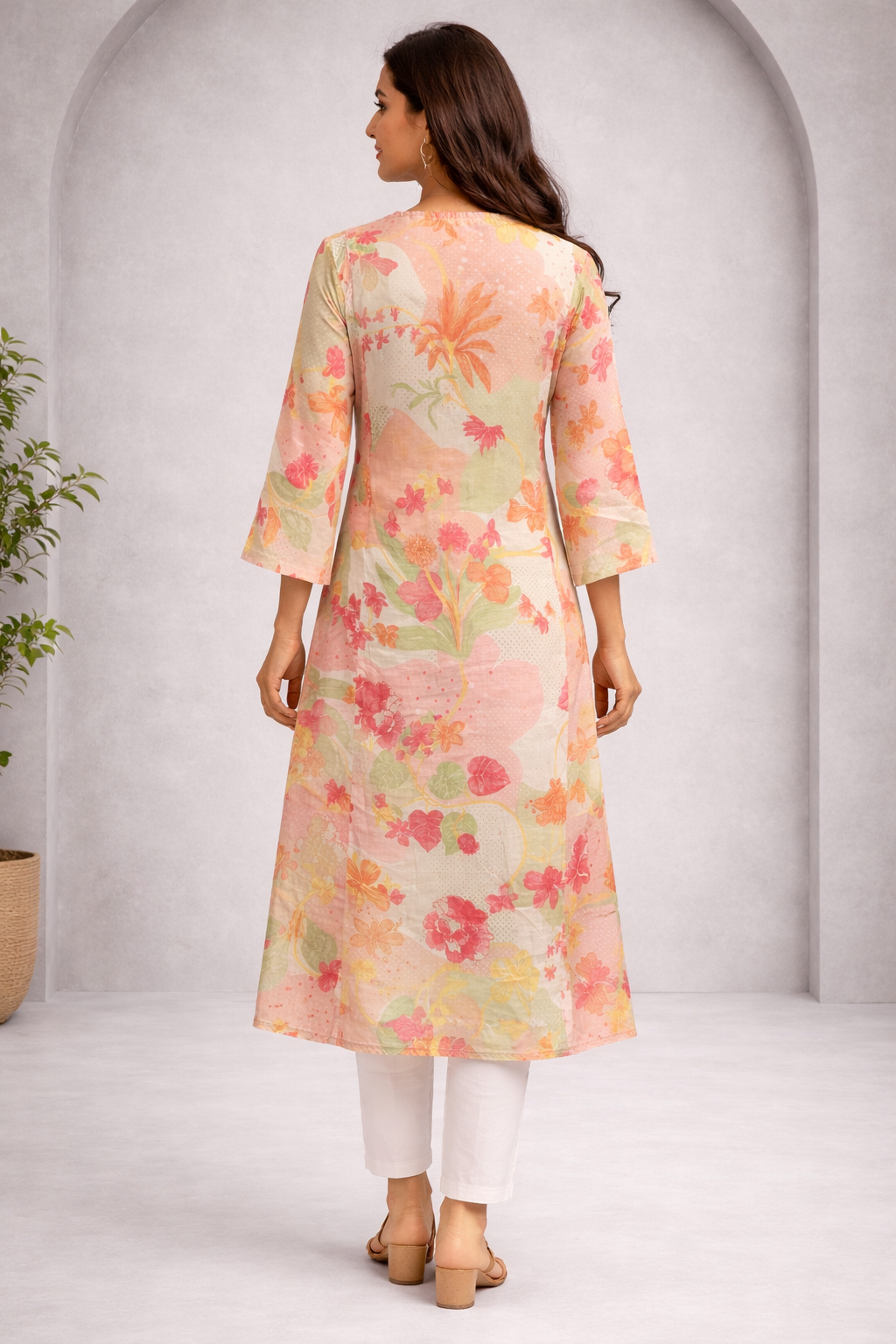 Bring effortless elegance to your wardrobe with the Vaanyah Peach Floral Printed Kurti. Designed for modern women who appreciate subtle charm and comfort, this kurti features a delicate floral print in soft pastel tones that create a fresh and feminine look.