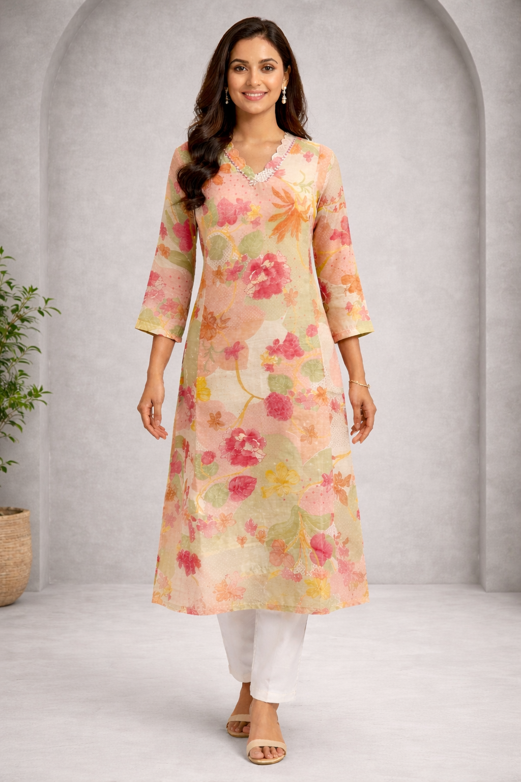 The flattering A-line silhouette provides a comfortable fit while enhancing your natural shape. The V-neckline with delicate detailing and three-quarter sleeves add a refined touch, making this kurti perfect for both casual and semi-formal occasions.